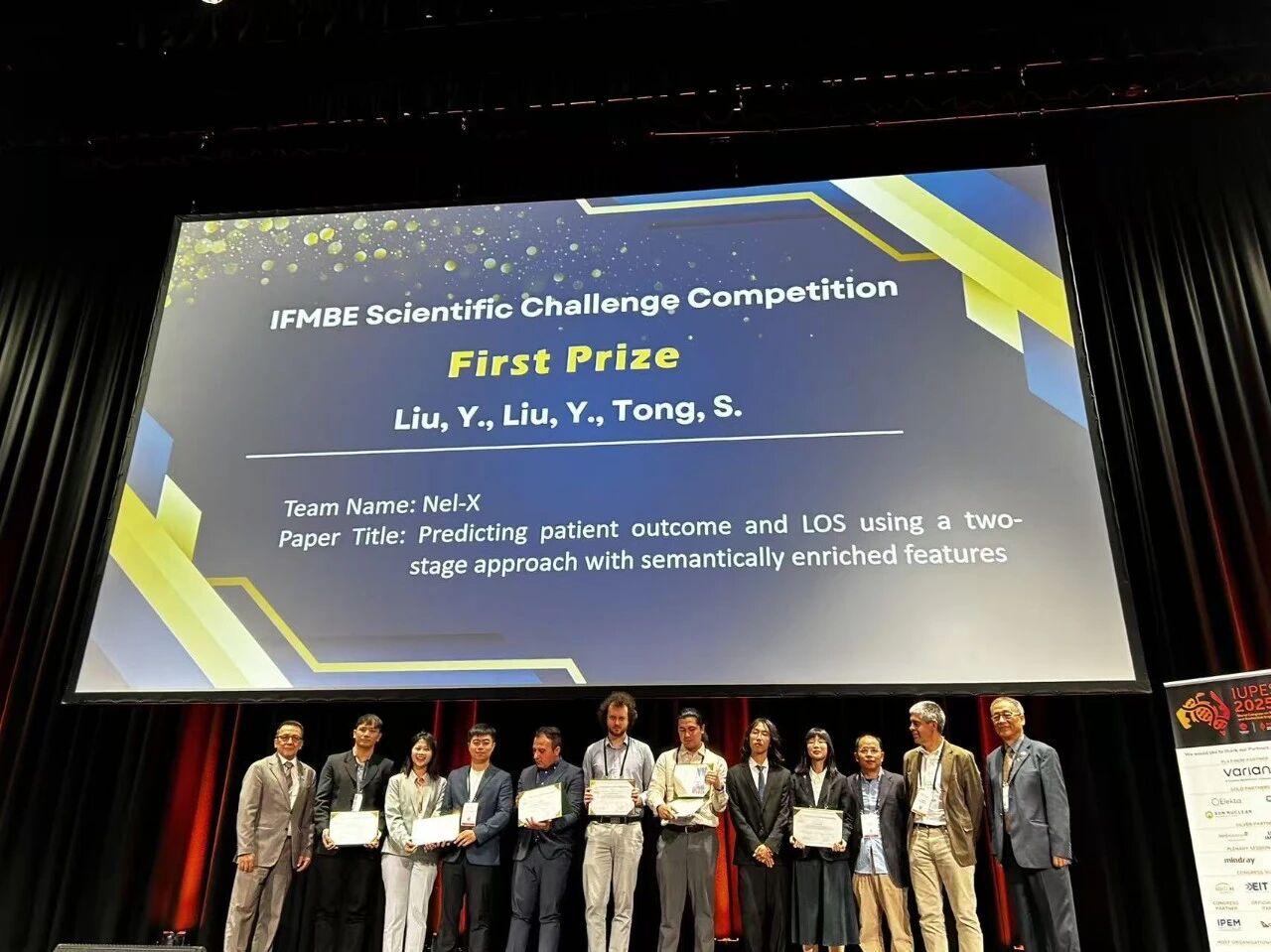 在大会同期举办的IFMBE Scientific Challenge Competition中,上海交大PO18 两名研究生刘钰沣和刘奕,凭借作品“Predicting patient outcome and LOS using a two-stage approach with semantically enriched features”脱颖而出,斩获该项竞赛第一名。该作品聚焦基于入院初始数据对患者住院时长与结局进行早期精准风险评估的临床需求,创新性地采用融合医学先验知识的ICD编码增强、多维度挖掘深层特征以及双阶段堆栈集成模型预测框架,展现出扎实的科研基础与前沿的创新思维,得到了竞赛评委的高度认可。这一奖项不仅是对两位学生个人能力的肯定,更是上海交大在生物医学工程领域人才培养质量的有力证明,凸显了学校在引导学生将理论知识与实际应用相结合、培养学生国际竞争力方面的显著成效。