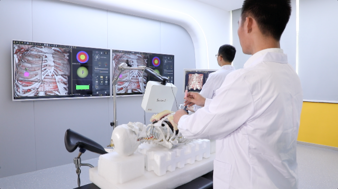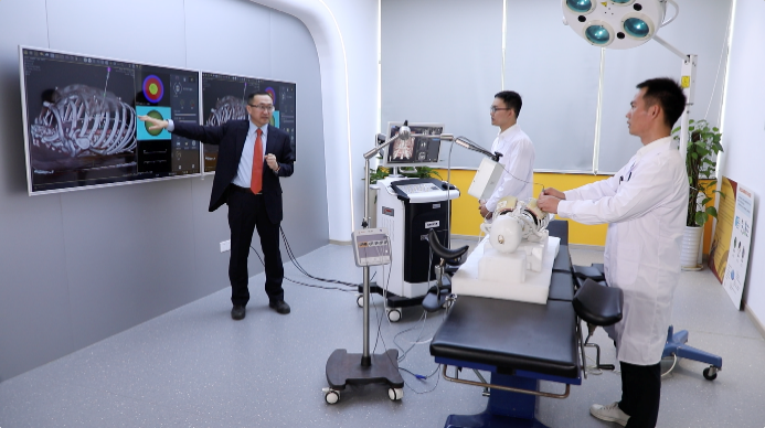 顾力栩团队基于电磁导航精确定位和人工智能组织漂移矫正技术研发了胸腹部肿瘤穿刺手术机器人系统。该系统具备基于CT三维影像的病灶自动分割、病灶的自动检测、病灶结构的分析、手术规划、术中电磁导航下的穿刺针示踪、呼吸的组织飘移矫正、目标区定位、手术机器人导航以及术后评估等功能,可以解决胸腹部早期微小病灶精准定位的临床痛点问题,结合临床循证医学研究攻克5mm至15mm早期微小病灶的穿刺盲区,实现早诊断早治疗的目标。