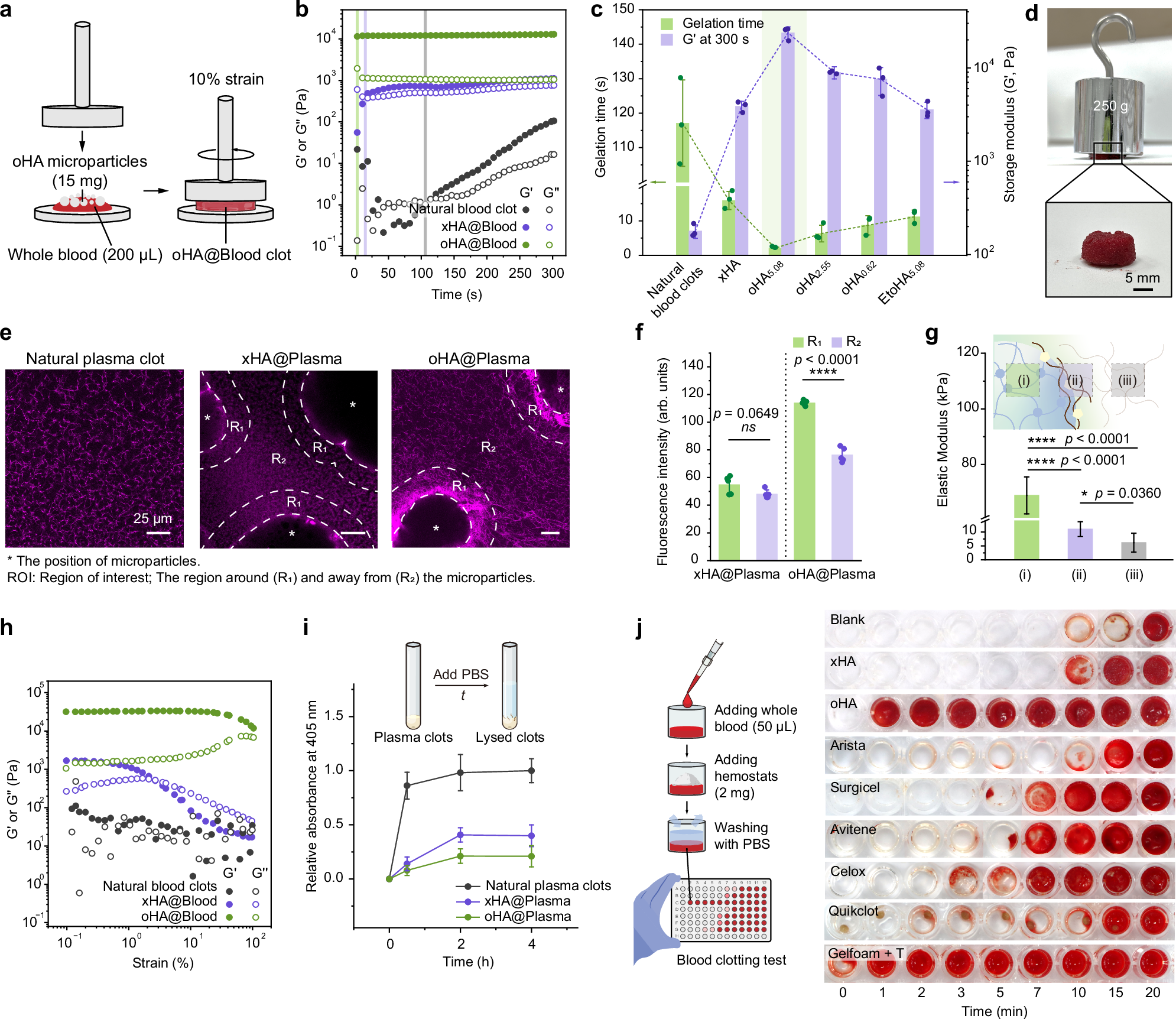 体外实验证实,BICMs通过整合预交联透明质酸网络与血液蛋白,加速了血凝块的形成,这一时间显著短于市售止血材料的凝血时间;并且,由BICMs形成的血凝块具有更高的机械性能。这种强化的血凝块得益于共价交联网络的构建,该网络不仅增强了血凝块内部的结构稳定性,还赋予其抵御外部剪切应力和体内纤溶酶降解的能力。在流变测试和纤溶模拟实验中,BICMs形成的血凝块均能有效维持形态完整性,确保其在复杂生理环境下持续发挥止血功能(图2)。