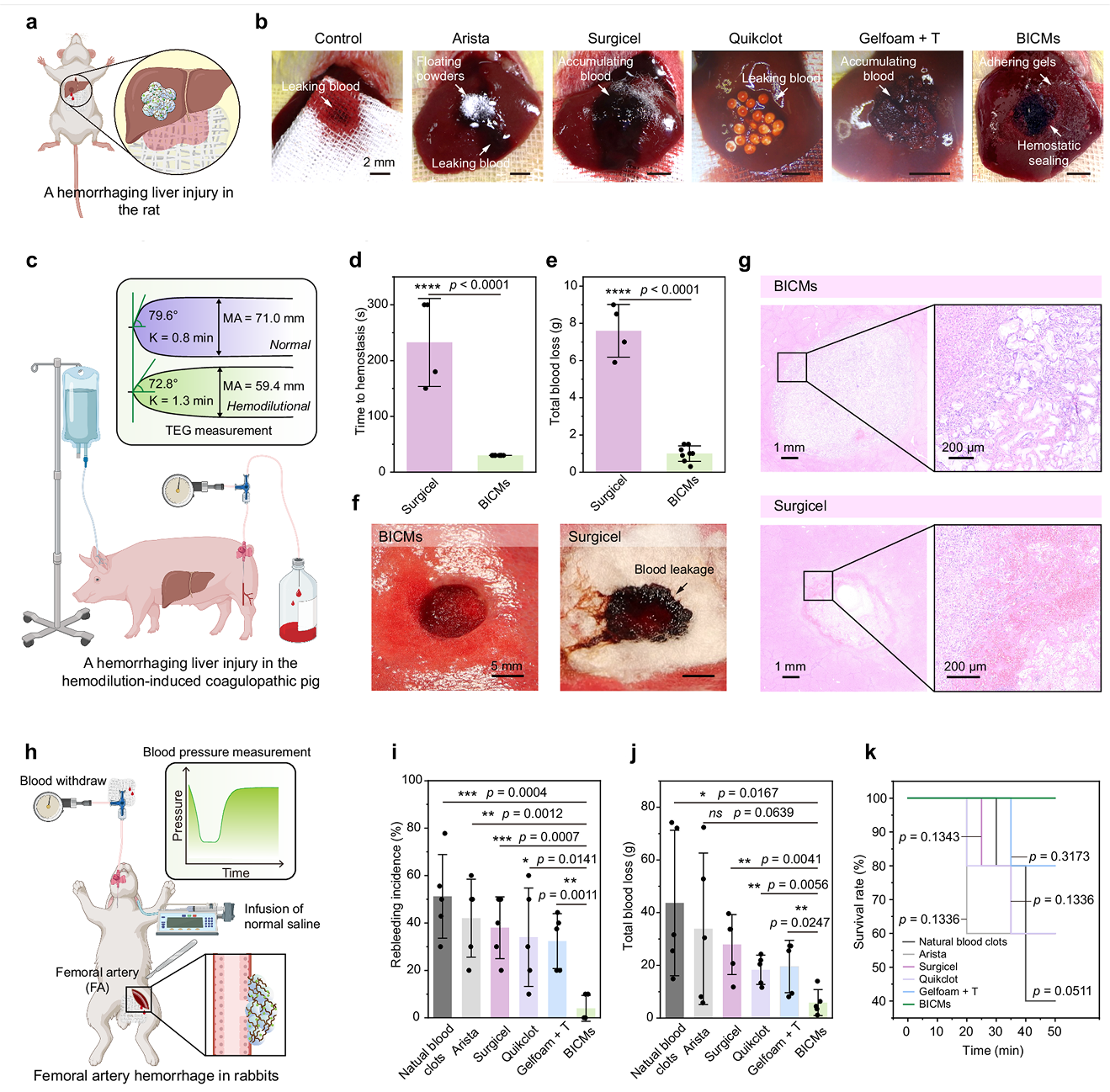 图4 BICMs在正常大鼠和低凝猪出血性肝损伤模型中快速止血,在兔股动脉损伤和液体复苏模型中有效预防再出血