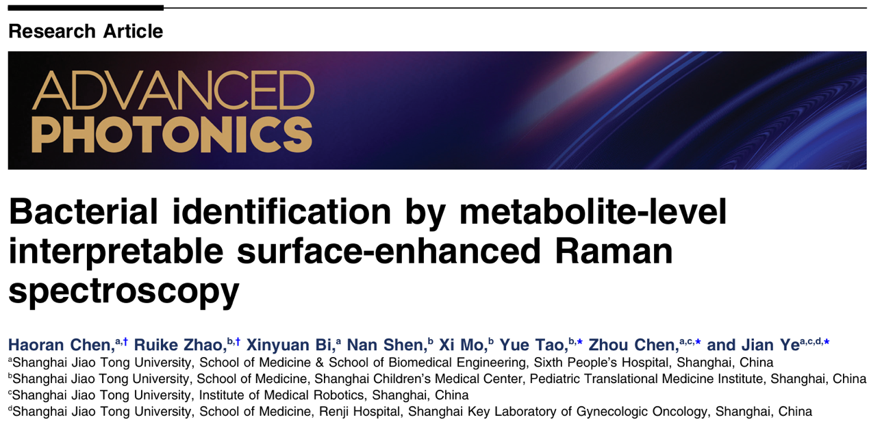 2025年6月20日Advanced Photonics期刊在线发表了题为“Bacterial identification by metabolite-level interpretable surface-enhanced Raman spectroscopy”的研究论文,该工作由PO18 叶坚教授团队和PO18 医学院儿童医学中心陶悦副研究员团队联合完成。该研究基于非标记表面增强拉曼光谱技术(Surface-enhanced Raman spectroscopy, SERS),开发了一种简单快速的细菌鉴定流程,验证了该方法中的光谱信息主要来自于小分子代谢物,基于这些信息搭建了用于细菌鉴定的可解释性卷积神经网络(CNN)模型。研究从颗粒表面选择性吸附分子的角度出发,解释了革兰氏阳性菌(Gram+)和革兰氏阴性菌(Gram-)在光谱上所出现的差异,通过结合激光解吸/电离质谱技术对颗粒表面的分子进行了鉴定,实现了 SERS 光谱在代谢物水平的系统性的光谱解析,为相关基于SERS的细菌诊断方法提供了理论基础。该工作有望推动具有分子可解释性的 SERS 诊断工具的开发,提升SERS在分析化学和其他生物代谢检测领域的应用价值。