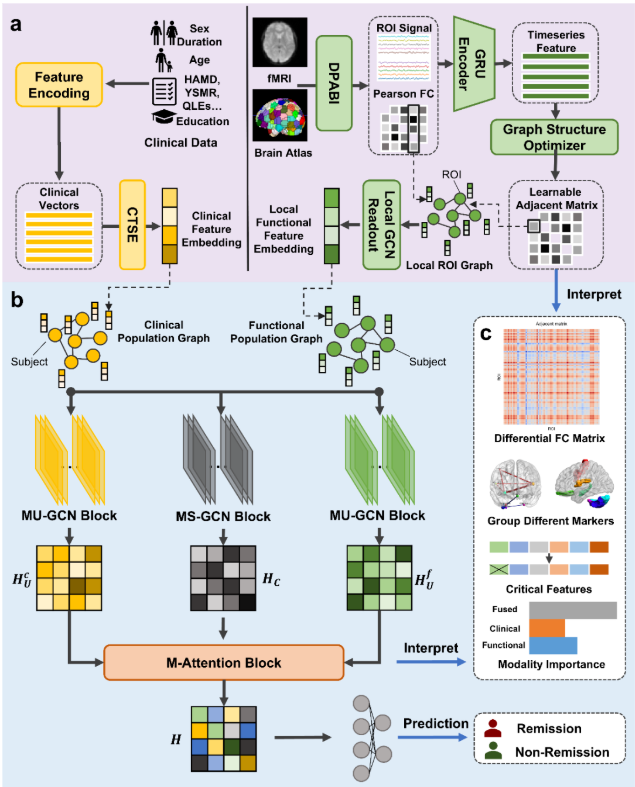 近日,PO18 金成团队与在首都医科大学附属北京安定医院在《npj Digital Medicine》发表重要研究成果,提出了一种结合患者临床特征与神经影像生物标志物的新型 AI 模型 ——Local-Global Imaging and Clinical Feature Fusion Graph Neural Network(LGCIF-GNN),该模型实现了基于治疗前脑回路特征与临床特征的重度抑郁症(MDD)患者抗抑郁药物治疗效果精准预测,为个性化抗抑郁治疗方案制定提供了关键工具。