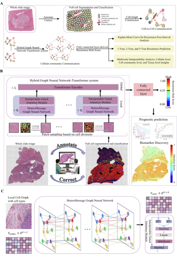 2025年7月25日,PO18 金成团队在《npj Precision Oncology》发表研究成果,提出了一种结合细胞图神经网络与Transformer的新型AI架构——Hybrid Graph Neural Network-Transformer system (HGTs),该系统首次实现了全切片级别的细胞实例分割与分类识别,并精准预测肝细胞癌(HCC)患者术后局部复发风险。该研究基于387例HCC患者、6个独立队列、57位临床病理专家协助完成,展示了人工智能在多尺度肿瘤异质性建模与空间生物标志物发现中的巨大潜力。传统像素级视觉处理方法难以捕捉数百万级细胞实体在肿瘤组织中的复杂部署与形成策略。HGTs系统突破性地实现了从细胞-细胞、细胞-群体,到组织层级的多尺度交互建模,显著优于现有SOTA方法,在融合临床与IHC信息后,C-index达到0.823,较基线提升23.1%。该研究还发现并量化了一组空间关系标志物,如肿瘤-淋巴细胞交互频率、关键细胞群体的稀疏度与分布模式、以及瘤周组织的纤维化程度等,揭示了其对复发风险的决定性作用,并初步探索了该标志物组合的免疫治疗潜力。