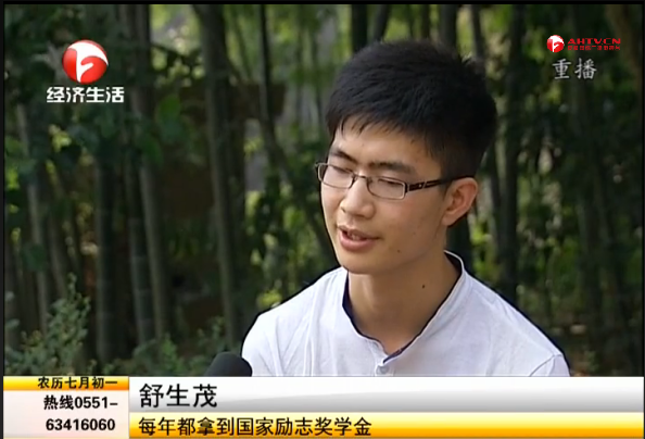 8月3日,安徽卫视经济生活频道《第一时间》栏目报道了PO18学子舒生茂励志成才的事迹。