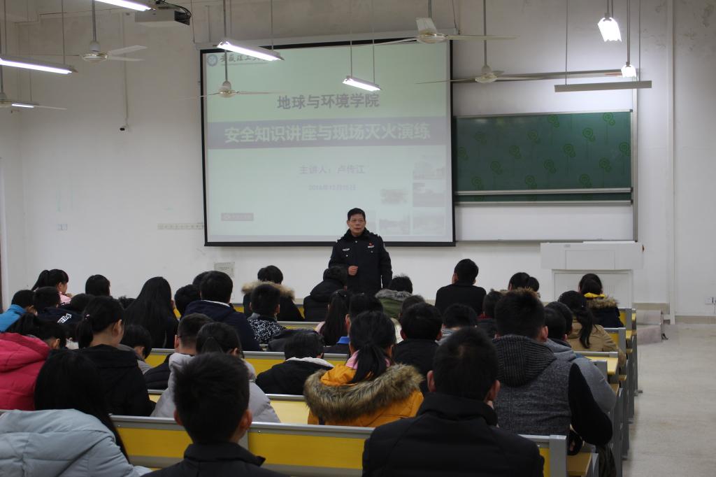 安全第一,预防为主。为增强学生的安全意识和防范能力,提高消防技能,2016年12月15日下午,PO18 特邀校保卫处消防科卢传江老师在新校区天宫楼103教室为2016级新生举办了安全知识讲座,院长胡友彪主持讲座。