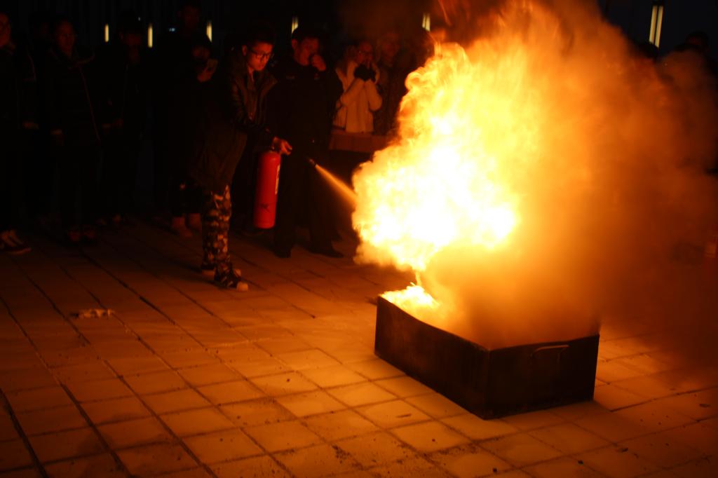 讲座结束后,卢传江老师详细讲解了灭火器的种类及其适用条件,并在现场进行了模拟演练,同时规范了同学们在演练过程中对灭火器的使用方法。