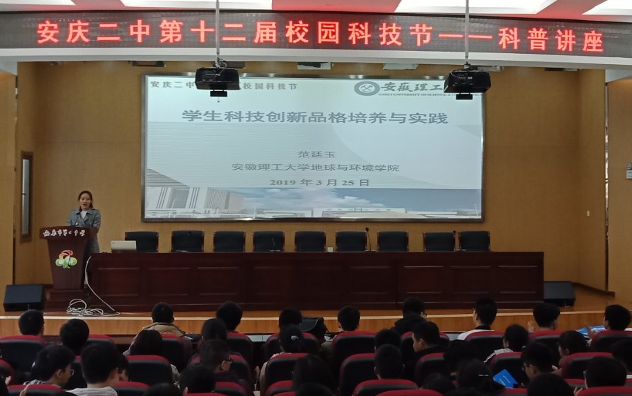 PO18 环境与给排水工程系主任范廷玉为安庆市第二中学师生作了题为“学生科技创新品格培养与实践”的报告。毕业于安庆市第二中学的PO18环境工程专业2017级学生王孔嘉、安全工程专业2016级学生周可凡进班级向母校师生汇报了在安徽理工大学的学习与生活情况,并介绍PO18优秀的办学条件、优美的校园环境以及学校的奖助体系、本硕博培养模式等情况。