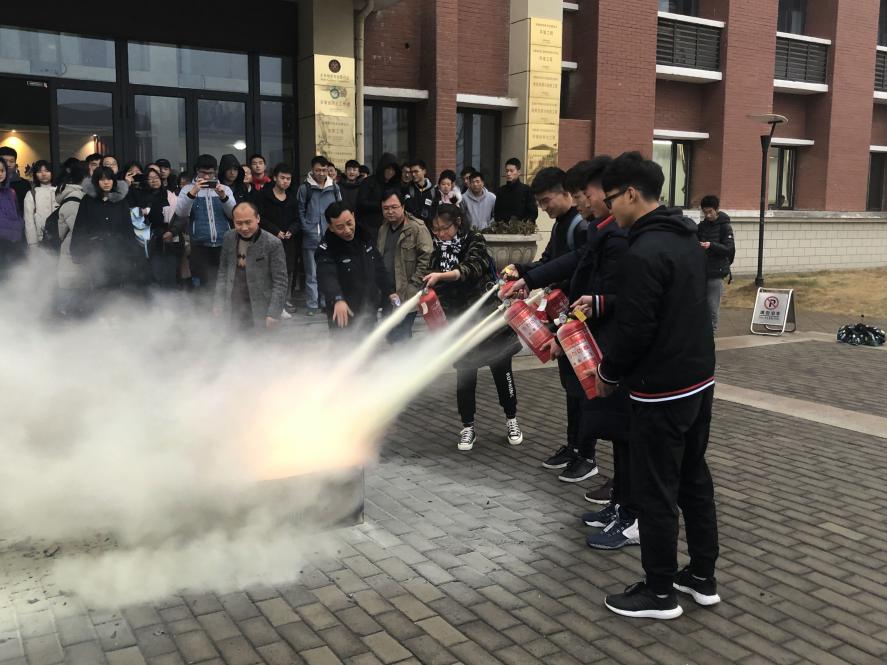 讲座结束后,在静远楼门前广场,彭广峰给PO18 师生详细介绍了不同类型灭火器的工作原理、使用方法,并指导师生开展了现场灭火实战演练。