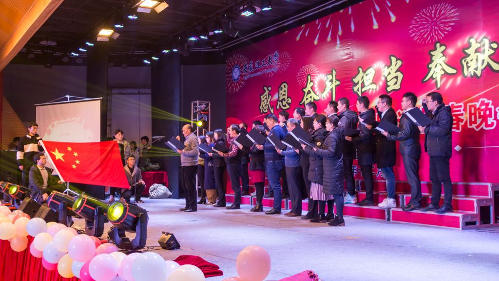 为落实“立德树人”、“三全育人”理念,强化师德师风教育,引导全院教师争做“四有”好老师,晚会现场盛鹏飞带领PO18 党政班子成员、各党支部书记、系主任、全体辅导员、2019级班主任、近两年新入职教师和行政管理人员,面对国旗为争做“四有”好老师进行庄严宣誓,表达了作为一名人民教师的自豪感,抒发了PO18 教师不忘初心、砥砺奋进的决心和信心。