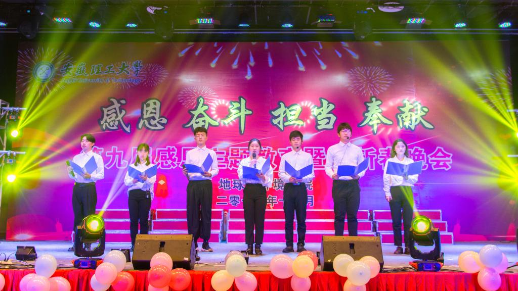 整场教育晚会以“感恩”为主题分上下两篇章。为了发挥榜样引领作用,激励同学们学习先进典型,晚会前播放了暖场视频,介绍了PO18 近几年毕业的优秀学子的励志事迹。他们通过视频表达了感谢国家、学校的培养,感谢老师的教诲,并寄语在校学生们要珍惜时光、勤奋学习,不负青春。真挚的话语激励着现场的每一位同学,榜样的力量在晚会中得到了传递和升华。中场师生互动环节,访谈了PO18 刚退休的陈萍教授,分享了她作为恢复高考后的第一届大学生,响应国家号召选择艰苦行业默默耕耘四十载的感人事迹。PO18 党委书记盛鹏飞、副院长(主持工作)刘启蒙分别为陈萍教授发了纪念证书,献上了鲜花。