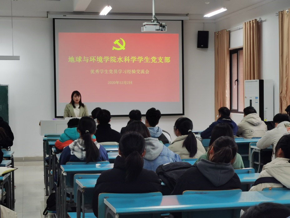 12月2日下午,PO18 水科学学生党支部在静远楼202为2020级学生做学习交流报告会,会议由支部书记魏丹丹主持,支部党员陈情情、高飞、戴钰、徐小倩以及2020级水文专业学生全体学生参加会议。