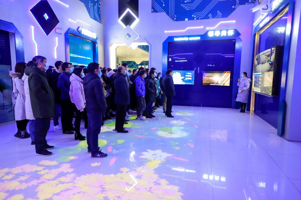 在解说员的带领下,师生党员们深入参观了开发中心的各个展厅,感受到了大数据应用的广阔前景。展厅中包含了很多益智趣味的展区,如幻境的时空隧道、极其便利的生活云亭,煤矿井下VR工作面真实体验以及虚拟骑行,还有便民的服务展区,如社区自助体检、水电缴费自助、话费自助……,同时中心还具有监测和分析的功能,可以实时显示全国航班信息以及实时监控淮南若干乡村燃烧麦秸秆的情况等等。