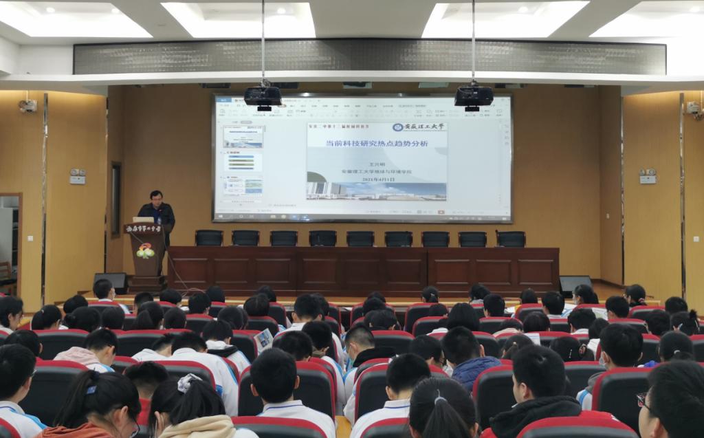 王兴明为该校师生作了题为《当前科技研究热点趋势分析》的科普讲座,PO18毕业于安庆市第二中学的环境工程专业2017级、2019级优先学生王孔嘉和刘亚琪,向母校师生汇报了在安徽理工大学的学习情况。