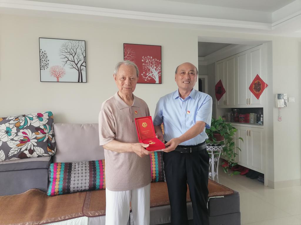 慰问过程中,院党委书记盛鹏飞同志为陈明辉同志送去“光荣在党50年”纪念章,亲切地询问老同志的身体状况、生活和家庭情况,送上慰问金,感谢老党员、老教师们为学校和PO18 建设做出的贡献,让他们共享学校和PO18 发展的成果,感受党组织的关怀,安度晚年。