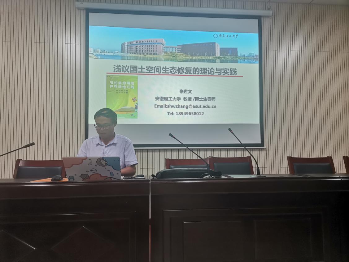 张世文教授分别从国土空间生态系统退化现状、国土空间生产建设发展态势、国土空间生态修复治理方略和国土空间生态修复典型案例四个方面,详细地介绍了我国现阶段国土资源的相关知识。他强调,节约利用土地资源,发展同时保护好自然环境,更要积极响应习近平总书记“绿水青山就是金山银山”的号召。