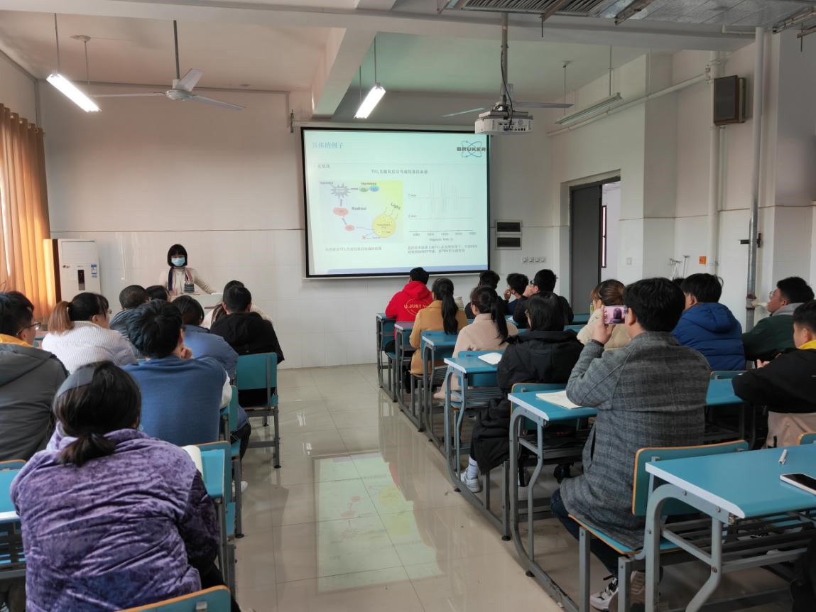 在静远楼A210多媒体教室,布鲁克(北京)科技有限公司杨佳慧博士结合多年工作经验,为在场的师生详细介绍了环境问题、EPR工作原理,重点介绍了EPR在自由基、过渡金属离子、催化反应机理、大气颗粒物(PM2.5)、污水处理高级氧化机理、化学反应动力学、环境中持久性自由基EPFRs等环境领域的应用案例等,并逐一解答了老师的提问。