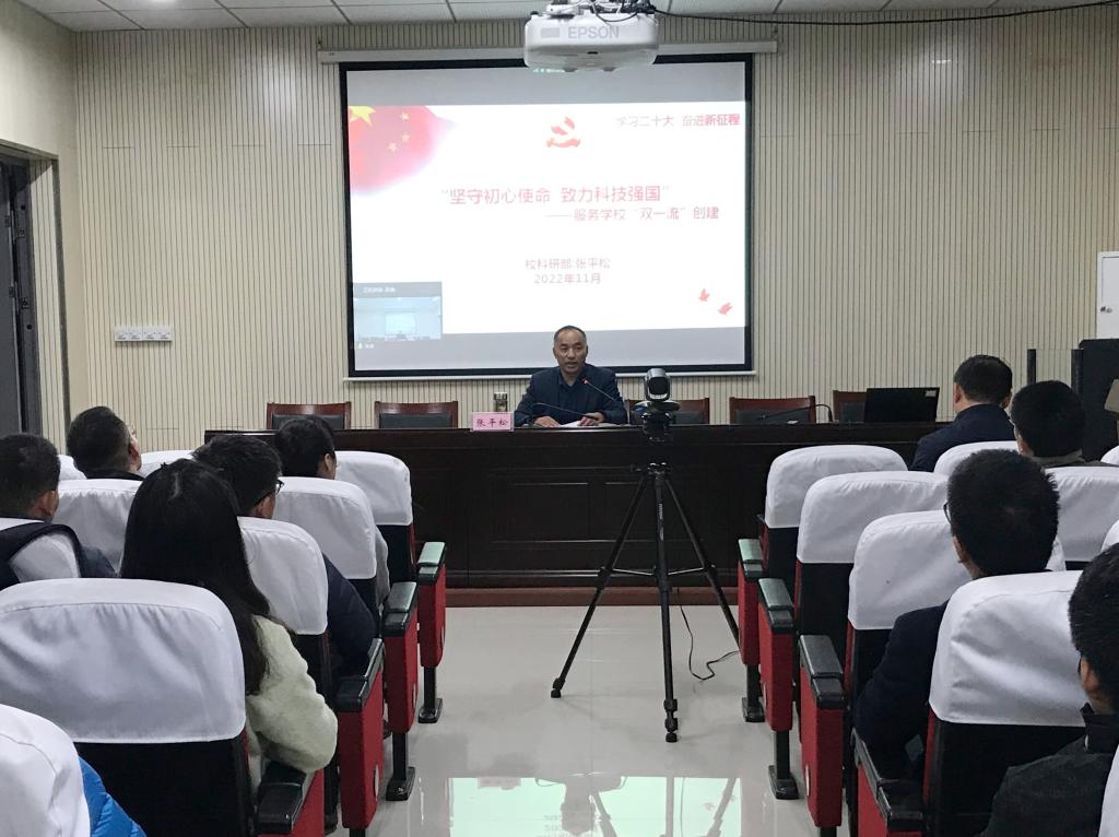 张平松首先带领师生党员共同学习了《党的二十大学习报告辅导百问》中“如何理解教育、科技、人才是全面建设社会主义现代化国家的基础性、战略性支撑”“如何理解提升国家创新体系整体效能”“为什么要加快实现高水平科技自立自强”“为什么增强自主创新能力要加强基础研究”等内容。他结合《安徽理工大学科学研究“十四五”规划》介绍了学校科研工作近5年的发展与提升,尤其针对学校科研平台、创新团队、科研协同、科研创新所取得的建设成效进行细致说明。他从科技评价考核、重大科研项目与成果孵化、高质量成果产出与转化等角度,交流了对推进校政、校地、校企、校际合作,构筑大平台、凝聚大团队、承接大项目、培育大成果的思考。他介绍了学校在服务国家“双碳”战略、推进“四个融入”,深化“五个融合”的具体举措,强调了科研工作要加强党的领导,充分发挥党员模范带头作用,充分发挥党的组织优势,凝聚师生力量。他推介了大学科技园对在校大学生创新创业的支撑,对青年学生科研兴趣培养、科技竞赛参与、重要奖项参评提出期望,对青年教师成长提出“讲品德、讲融入、讲定位、讲实践、讲组织”等建议。