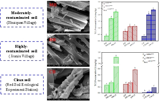 生物炭近年来在环境修复方面具有很好的应用,但是不同来源生物质制备的生物炭含有内源重金属含量差异显著,环境老化如干湿、冻融、酸雨等是否会活化生物炭内源重金属,增加潜在的环境风险,当前的研究鲜有报道。基于此,崔红标课题组采集了清洁区、中度和重度污染区巨菌草秸秆并制备生物炭,研究发现干湿和冻融老化促进生物炭内源重金属的活化(Cuiet al., 2021, Journal of Cleaner Production, 862:160690),且高含量内源镉生物炭应用土壤后,老化作用增加了土壤镉生物有效性,增加了生菜镉富集的环境风险(Cui et al., 2021, Science of the Total Environment, 862:160690;Cui et al., 2023, Ecotoxicology and Environmental Safety, 255:114820)。