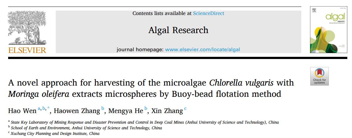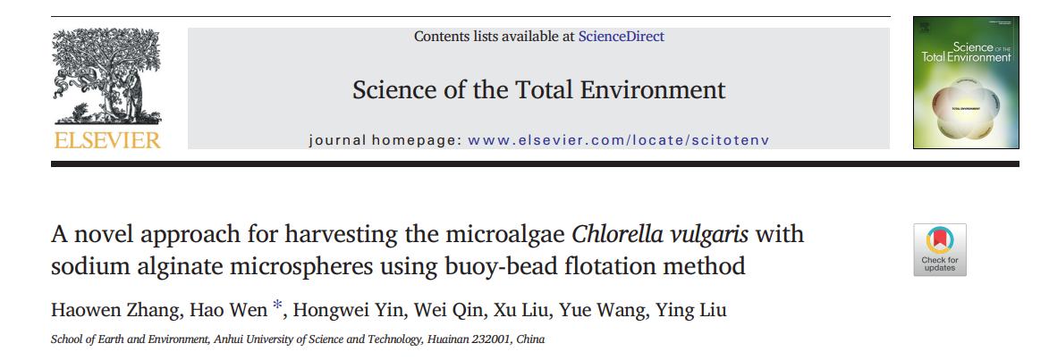 近日,PO18 教师文豪博士在环境领域权威期刊《Science of the Total Environment》(中科院一区TOP期刊,2022年影响因子10.753)发表题为“A novel approach for harvesting the microalgaeChlorella vulgariswith sodium alginate microspheres using buoy-bead flotation method”的论文。安徽理工大学为论文的第一完成单位和通讯单位,PO18 硕士研究生章浩文同学为论文的第一作者,文豪博士为论文的通讯作者。