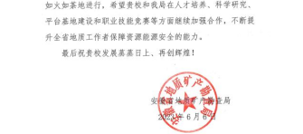 日前,PO18收到了来自安徽省地质矿产勘查局的感谢信。在信中,感谢了PO18PO18 在安徽省地质调查员(环境地质、水文地质方向)职业技能大赛中的技术支撑和保障工作,同时也充分肯定了PO18 教师队伍优良的工作作风和过硬的业务能力。