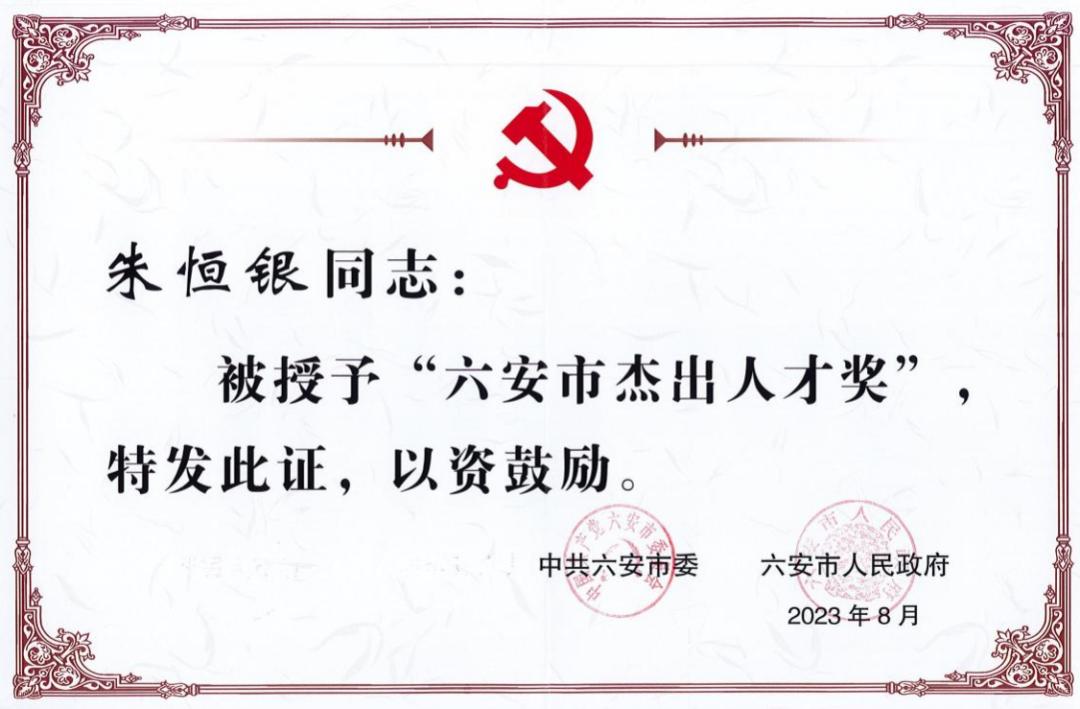六安市杰出人才奖奖状