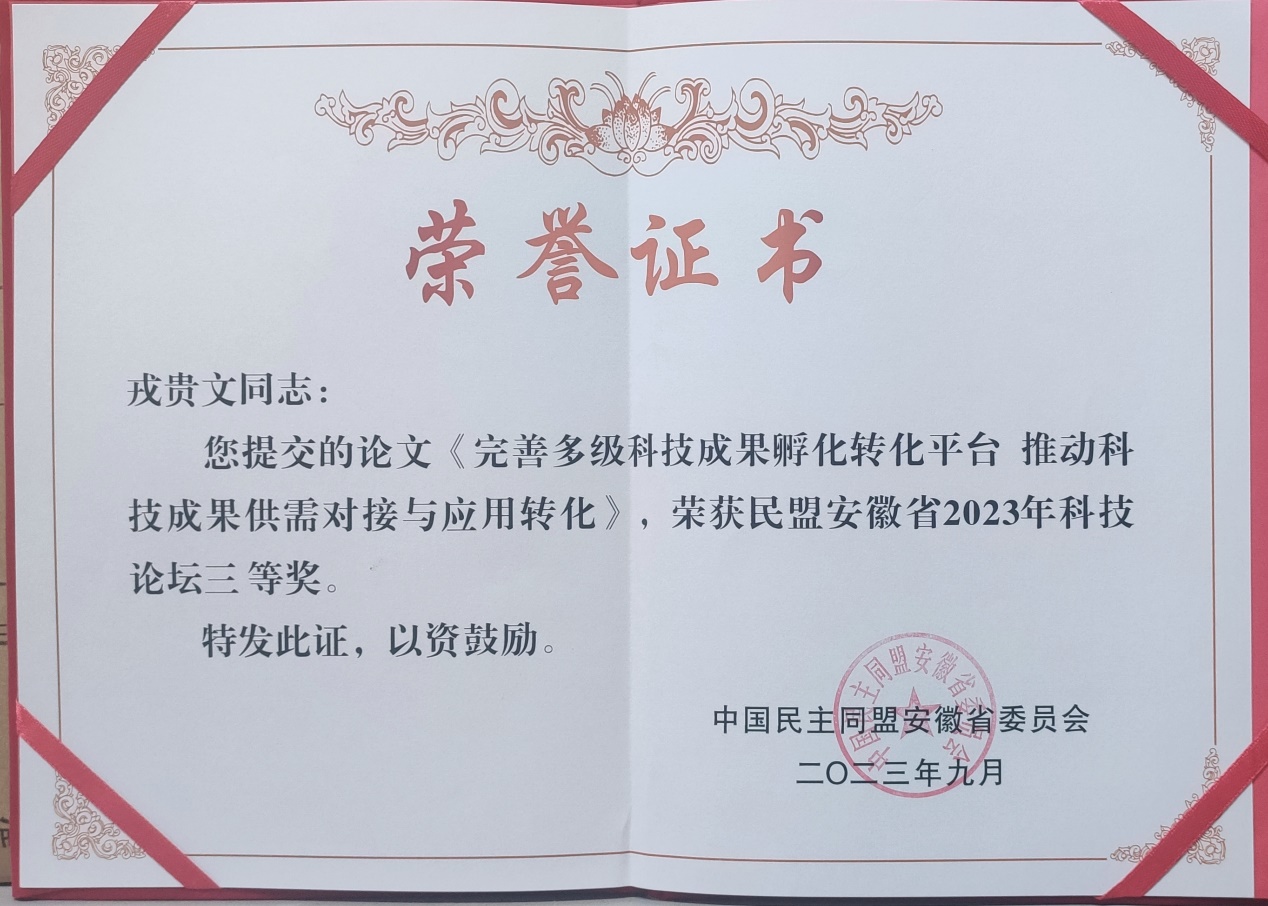 为加快科技成果转化应用,全面塑造发展新优势,助力安徽省推进高水平科技强省和创新型省份建设,本次论坛以“创新合作机制、促进科技成果转化”为主题,共收到全省报送的论文80篇,经专家评审,共评出组织奖3个,论文一等奖6篇、二等12篇、三等奖18篇。戎贵文教授报送的论文《完善多级科技成果孵化转化平台、推动科技成果供需对接与应用转化》荣获科技论坛三等奖。