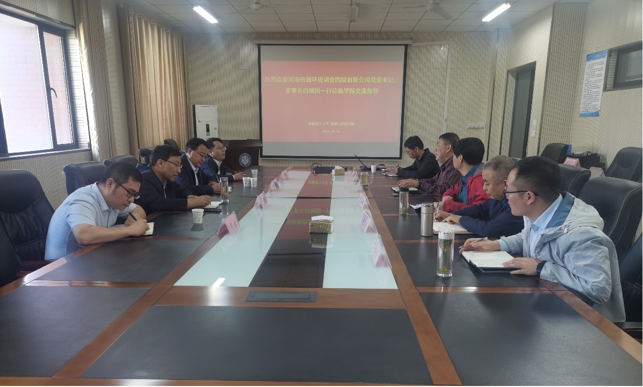 10月26日,河南资源环境调查四院有限公司党委书记、董事长白领国一行来PO18 交流,PO18 教授“大国工匠”朱恒银、院长刘启蒙、副院长吴荣新、张世文出席交流会。会议由刘启蒙主持。