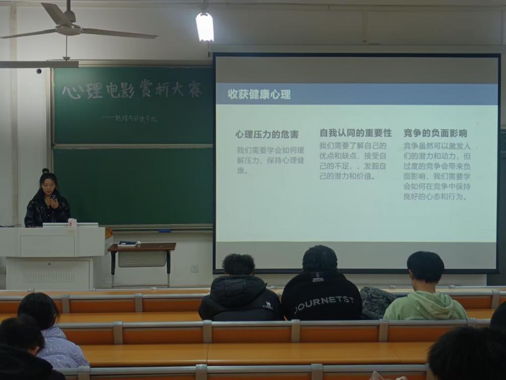 本次活动以“心随影动,以影观心”为主题开展,参赛选手从心理影片中任选一部,制作成PPT进行赏析。选手们用饱满的精神状态、生动的语言、流畅自然的表达,阐释了影片中的心理学知识和蕴含的心理健康意义,抒发真情实感,从中感悟梦想的力量、成长的意义、爱和希望的真谛。经过激烈角逐,最终石晨馨同学获得比赛一等奖,沈绍峰和朱梓铭两位同学获得二等奖,吴颖雪、赵雅秀和赵清志林三位同学获得三等奖。