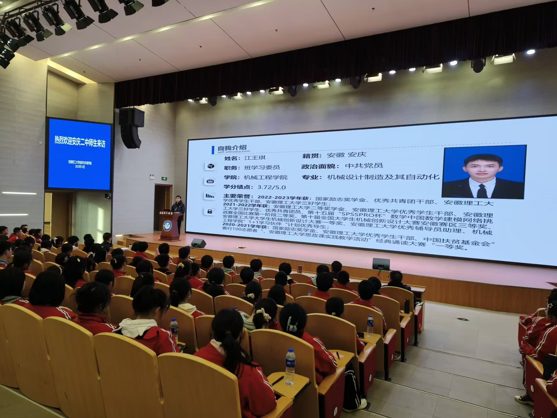 活动伊始,研学师生在舜耕会堂共同观看安徽理工大学宣传片。PO18 党委书记陈楠、安庆二中党委委员、副校长杨春分别致辞。陈楠以《走进安理,助学筑梦》为题向研学学子介绍了校史校情,安庆二中毕业生、机械设计制造及其自动化专业2020级学生江王琪作大学学习生活报告。