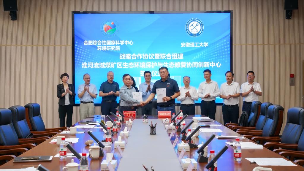 会上,郭永存、刘文清为合肥综合性国家科学中心环境研究院-安徽理工大学淮河流域煤矿区生态环境保护与生态修复协同创新中心揭牌,校院双方签订战略合作协框架协议。
