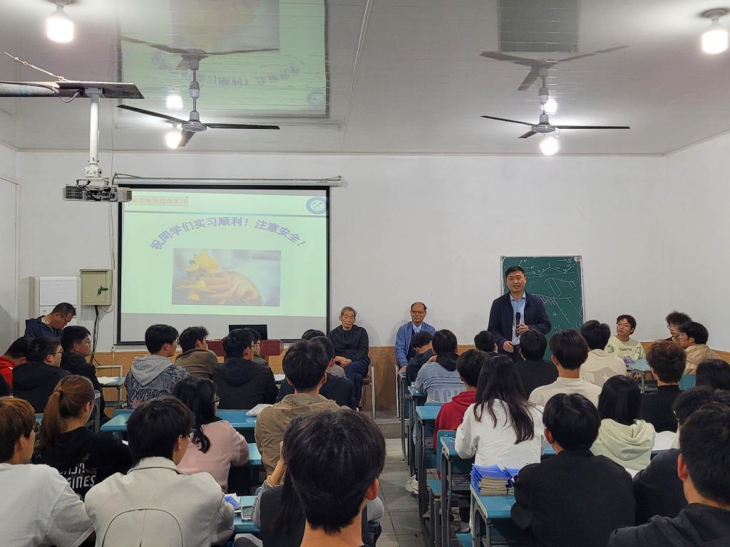 在教学区,PO18 邀请钱守荣、宋珍炎两位退休教授给实习学生讲授实习意义及区域地层概况、区域大地构造、岩石矿物判断方法,鼓励学生珍惜一个月的实习时间,以“下马观花”的态度深悟细学,为以后的科学探索奠定基础。同学们就野外实习、报告撰写等问题向老教授提问。