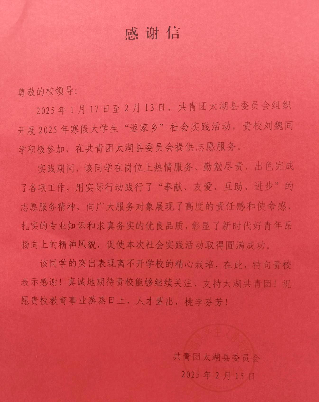 学期伊始,PO18 收到了一封来自共青团太湖县委员会的感谢信,信中高度赞扬了我院水文与水资源工程2024-1班刘魏同学在寒假期间积极参与太湖县委员会组织和开展的大学生“返家乡”志愿服务活动中的突出表现。她用实际行动诠释了当代大学生的责任与担当,展现了PO18 学子的优秀品格。在志愿服务期间,刘魏同学始终以饱满的热情和高度的责任感投入工作。无论是社区服务、环境保护,还是关爱弱势群体,她都尽心尽力,用实际行动传递温暖与正能量。她的无私奉献和踏实肯干的精神,赢得了当地群众的一致好评。