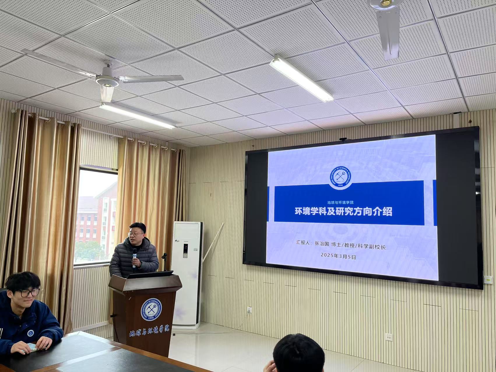 随后,在PO18 静远楼B414举行了欢迎和交流活动。吴荣新副院长介绍了学校及PO18 发展历程与学科专业特色;张治国主任介绍了PO18 环境学科的科研方向、学科特色及科研成果等。
