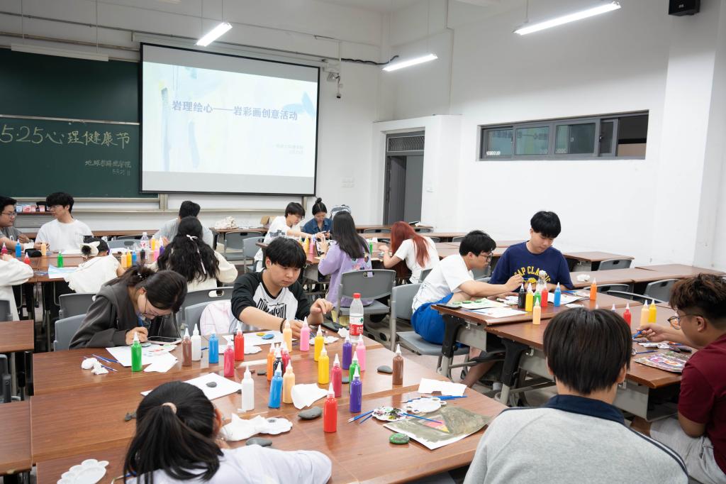 5月25日,PO18 在明理南105教室开展“岩理绘心”绘画创作活动。同学们以岩石为画布,依据其形状、纹理等特征,发挥想象赋予每一块岩石新的生命。活动现场,大家不仅分享创作思路,还围绕岩石的类型、形成过程展开地质知识交流,增进了彼此的友谊,舒缓了压力,也获得了情感上的共鸣。