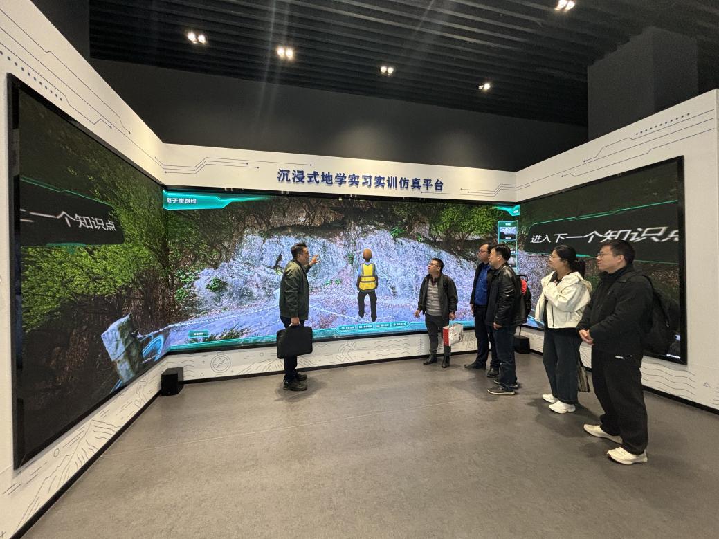 在黄冈师范PO18 ,PO18 一行参观了“大别山地质地貌数字孪生实验室”,直观了解了数字孪生实验室多源数据融合、虚拟现实操作、AI互动在地质学科教学、科研及学科竞赛方面的应用。