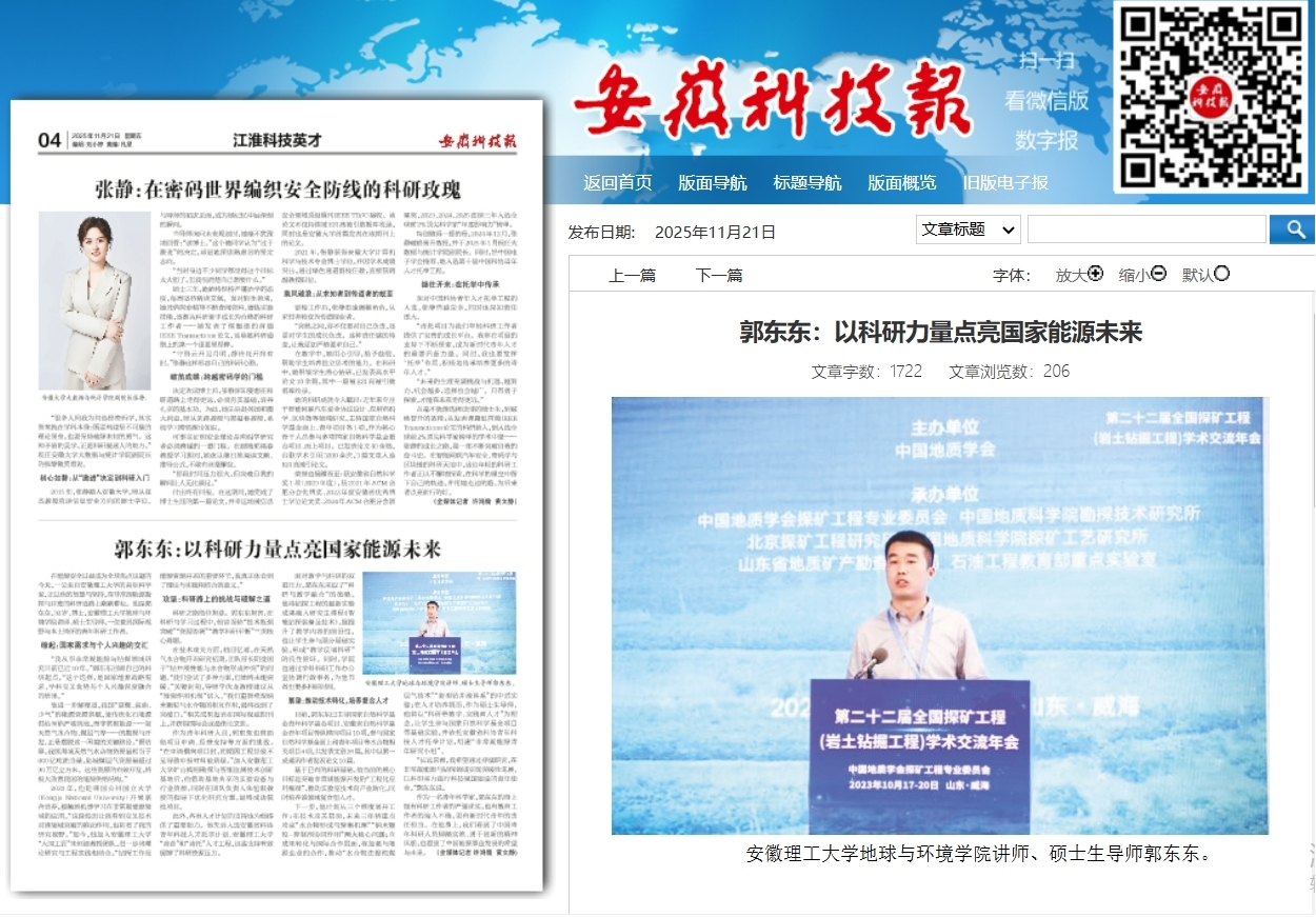 近日,安徽省科学技术协会与《安徽科技报》联合聚焦PO18 青年教师郭东东在非常规能源勘探与开发领域的科研成果,并以《郭东东:以科研力量点亮国家能源未来》为题进行宣传报道。
