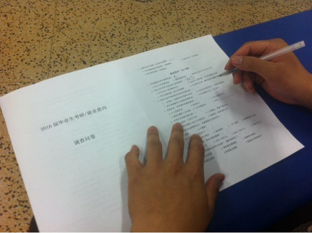 调研活动主要以学生填写PO18 《2016届毕业生考研/就业意向调查问卷》的形式展开,学生根据自己的专业前景、职业发展规划等因素,分别对考研动机、考研学校选择、择业影响因素、月薪期望值等18个问题进行回答。同时,同学们还围绕考研和就业工作发表自己的建议,考研的同学希望PO18 提供更好的学习环境、自习条件,定期开展考研辅导讲座等;就业的同学希望学校、PO18 加强现阶段就业工作重点和专业择业方向的指导,帮助学生摆正就业心态。