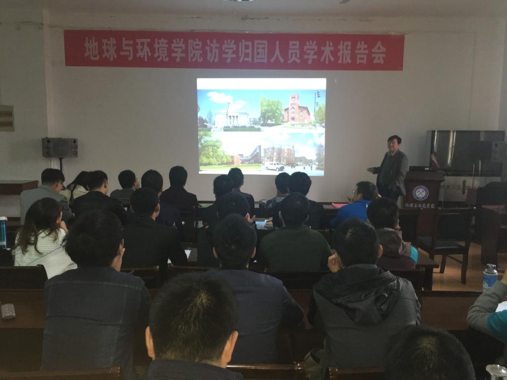 11月4日下午,PO18 在PO18 学术报告厅举行了访学归国人员学术报告会,邀请2014年赴美国University of lowa交流访问的许光泉教授和2012-2015年在韩国韩瑞大学攻读博士学位的陈要平博士为地质和环境学科师生做学术报告,会议由胡友彪教授主持,共有两大学科研究生及相关教师60余人参加了报告会。