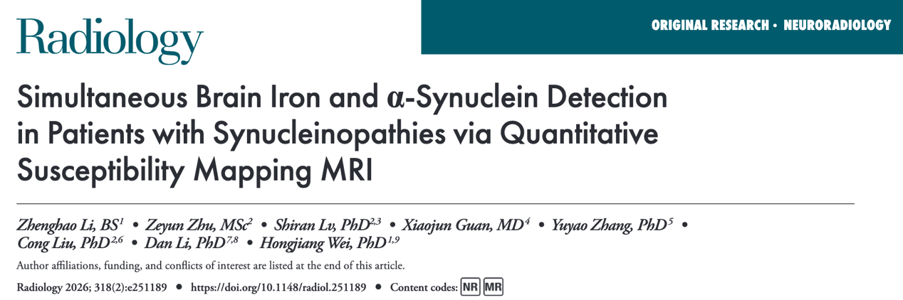 α-突触核蛋白(α-Syn)的异常聚集及其与脑内铁沉积的相互作用,被认为是帕金森病(PD)和多系统萎缩(MSA)等突触核蛋白病的核心病理机制,在疾病发生与发展过程中发挥关键作用。其中,α-Syn在深部灰质核团(DGM)的病理性沉积是此类疾病的典型组织学特征。然而,当前临床实践与科研领域面临显著瓶颈:尚无影像学技术能够实现α-Syn聚集与铁沉积的无创在体同步、特异性检测,导致PD与MSA等表型相似的突触核蛋白病在早期鉴别中困难重重。现有方法仍存在局限:种子扩增试验虽敏感但属有创操作;α-Syn PET成像虽具直接示踪潜力,却受限于放射性暴露、检查耗时长及示踪剂脑内结合率低等问题。因此,开发一种无创同步量化两种关键病理标志物的影像学策略,已成为突触核蛋白病精准诊断与分型的迫切需求。