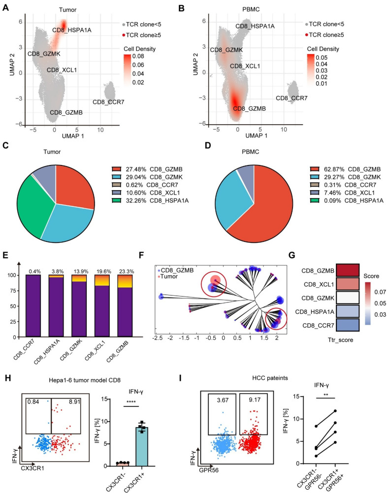研究进一步通过单细胞TCR测序联合生物信息学分析,对其肿瘤反应性进行了系统验证。结果显示,外周血CX3CR1+GPR56+CD8+ T细胞与肿瘤内富集的肿瘤反应性T细胞(Ttr-like)共享高度同源的TCR序列,其TCR克隆型在肿瘤组织中存在显著扩增,证实该群细胞具备精准识别肿瘤抗原的核心特征。体外自体抗原共培养实验显示,CX3CR1+GPR56+ T细胞在接触肿瘤细胞后可大量分泌IFN-γ,证明其具备肿瘤特异性识别与应答能力。与此同时,研究通过TCR谱系追踪证实,多模态肿瘤治疗可显著驱动CX3CR1+GPR56+肿瘤反应性T细胞发生克隆性扩增,而这一现象在RFA组中并未出现,进一步说明CX3CR1+GPR56+ T细胞可能是介导多模态肿瘤治疗抗肿瘤免疫效应的关键功能性亚群。